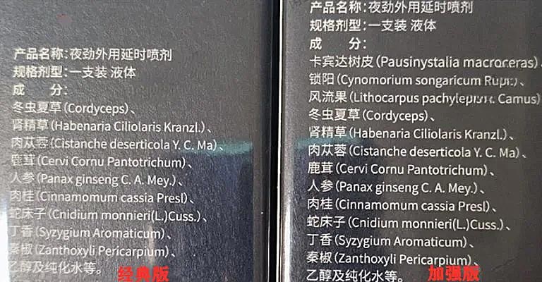 夜劲5代加强版是一种含有多种天然成分的产品。其中包括卡宾达树皮、锁阳、风流果、冬虫夏草、肾精草、肉苁蓉、鹿茸、人参、肉桂、蛇床子、丁香、秦椒、乙醇和纯化水。与经典版相比,加强版的成分更加丰富,未添加化学成分,更加安全更加可靠。